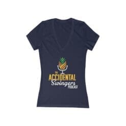This deep V-neck tee brings relaxed, breathable comfort to listeners and hosts who love the candid vibe of The Accidental Swingers Podcast. The slim, lightweight cut drapes close to the body without weighing you down, and the flattering neckline frames layered necklaces or a casual denim jacket. A bold pineapple-and-microphone logo sits on the chest in warm, vintage-inspired colors, signaling a playful, confident sense of humor that fits nights out, podcast meetups, or low-key recording sessions.